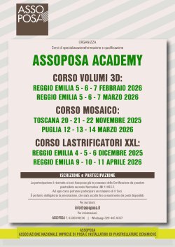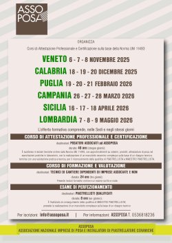 leggiA Cersaie 2025 sono uscite le date provvisorie per i corsi di Assoposa Academy Attestazione Professionale ed Esami di Certificazione sulla base della ...